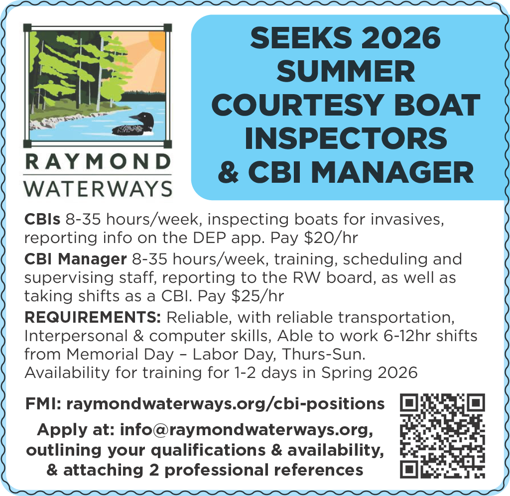 Raymond Waterways is seeking to hire Courtesy Boat Inspectors and a Boat Inspection Manager. If interested please submit directly to them.