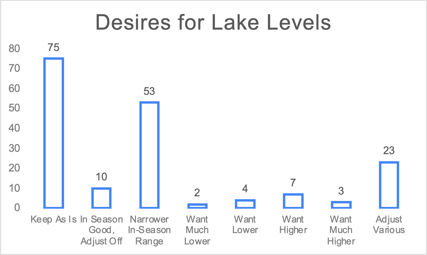 Only 6 respondents wanted the lake lower in all respects, while 10 respondents wanted it higher in all respects.