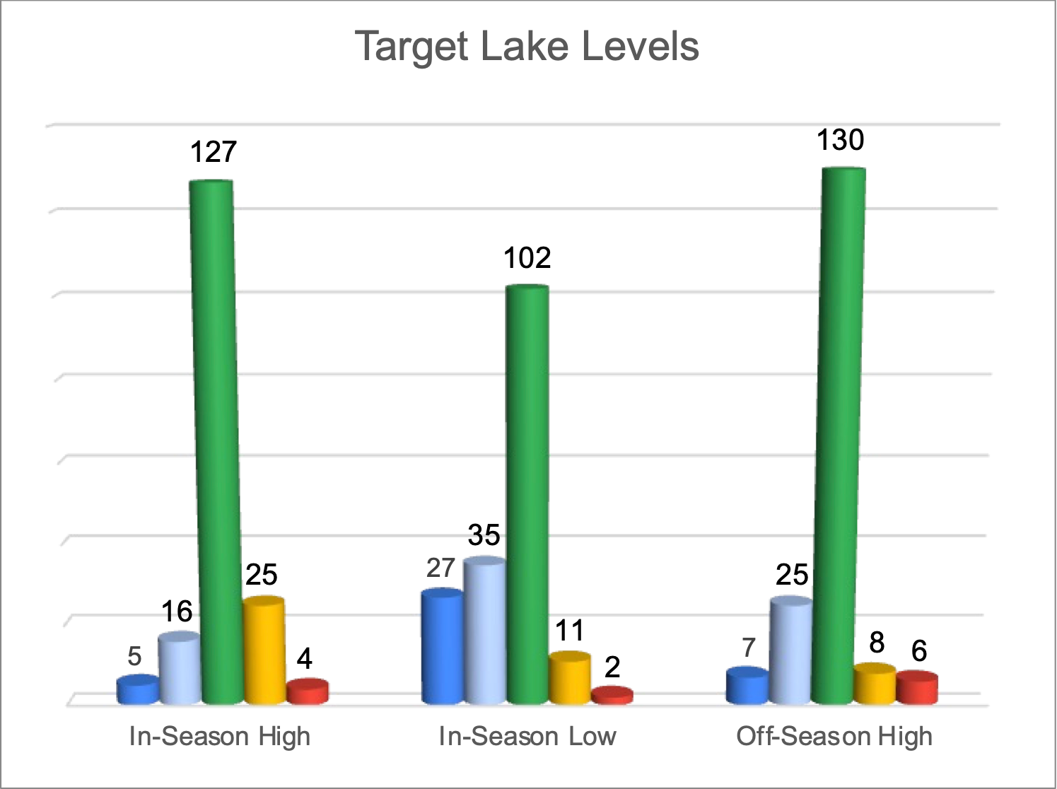 There was a strong dislike for very low off-season lake levels. The current practice of drawing down to 26 or 27 inches below the max off-season level is reasonably well accepted and historically provides sufficient “room” for spring thaw and rains.