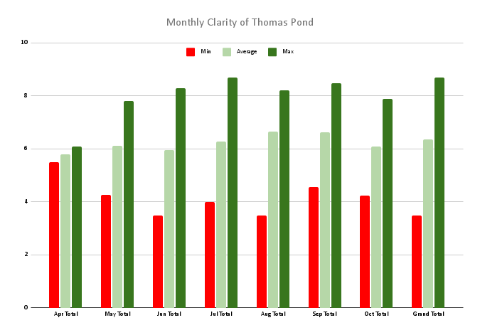Clarity is measured using a device called a Secchi disk and a “scope” to break the surface of the water. There are regular readings, typically twice/month in season, for clarity dating back as far as 1999.